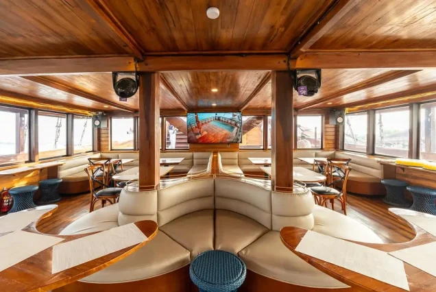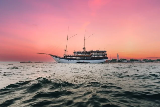 Enjoy a romantic sunset dinner cruise aboard a traditional phinisi ship in Benoa. This experience includes a buffet dinner, live music, cultural dance, fire dance, and entertainment. It is perfect for couples and families who want a special evening at sea. Book your cruise experience with *MarviO Tour*.
